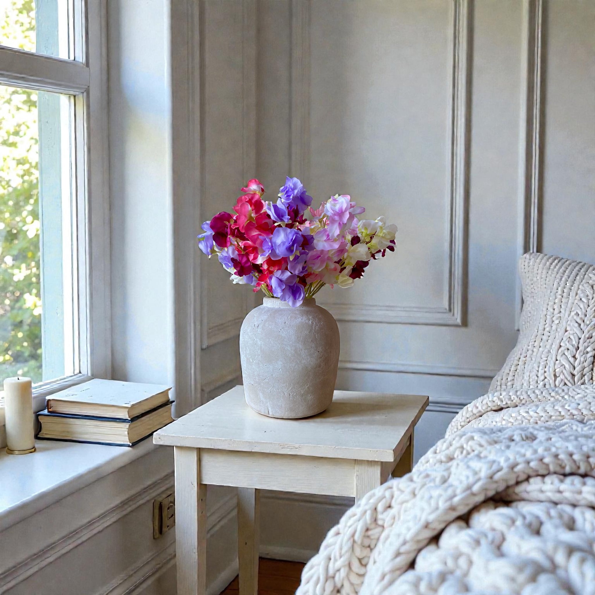 Enjoy your favourite sweet pea colours all year round. This delightful bunch of sweet pea includes 12 stems in colours of ivory, light pink, cerise, aubergine, lilac and peach.