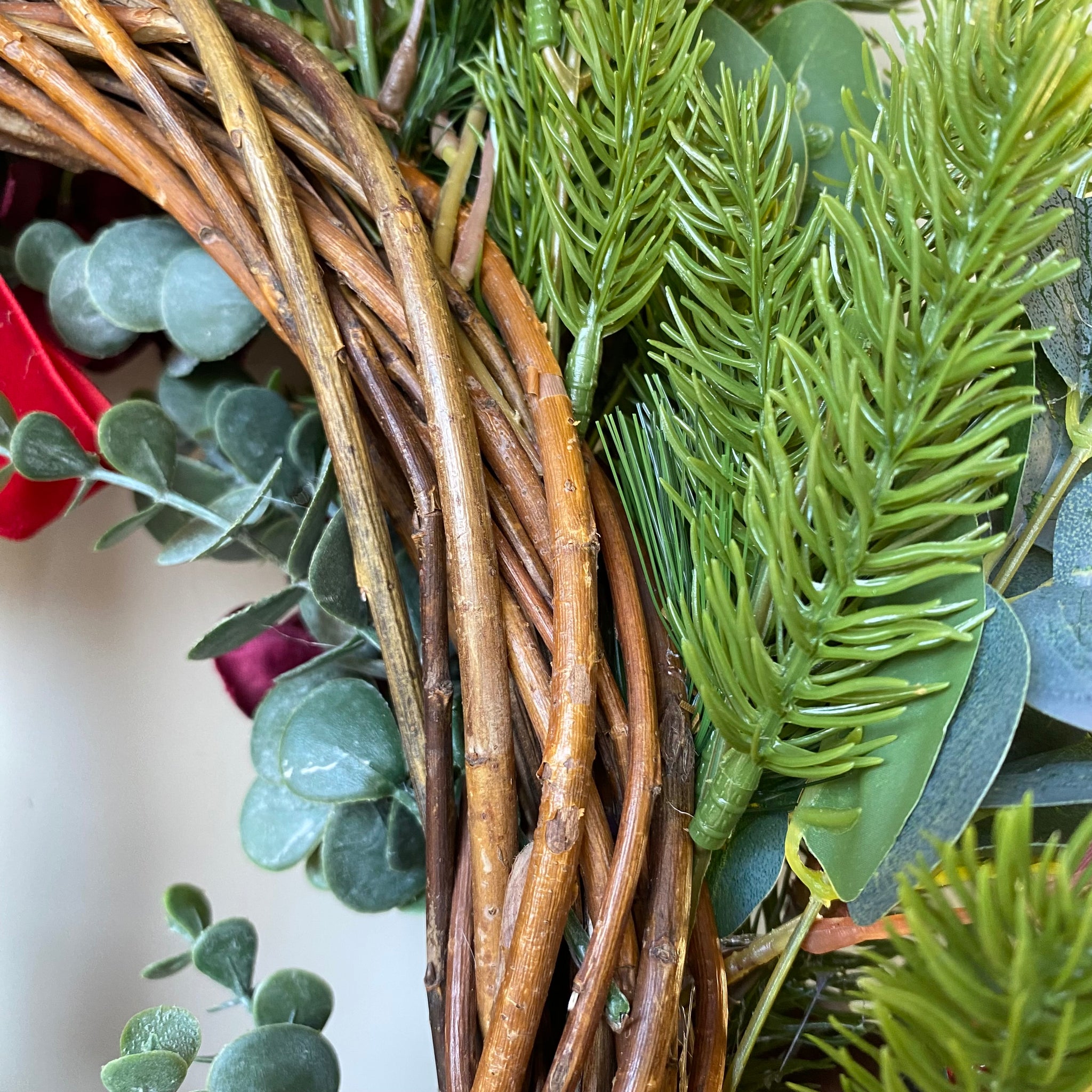 Material: Natural willow base, faux flowers and jute twine to hang.