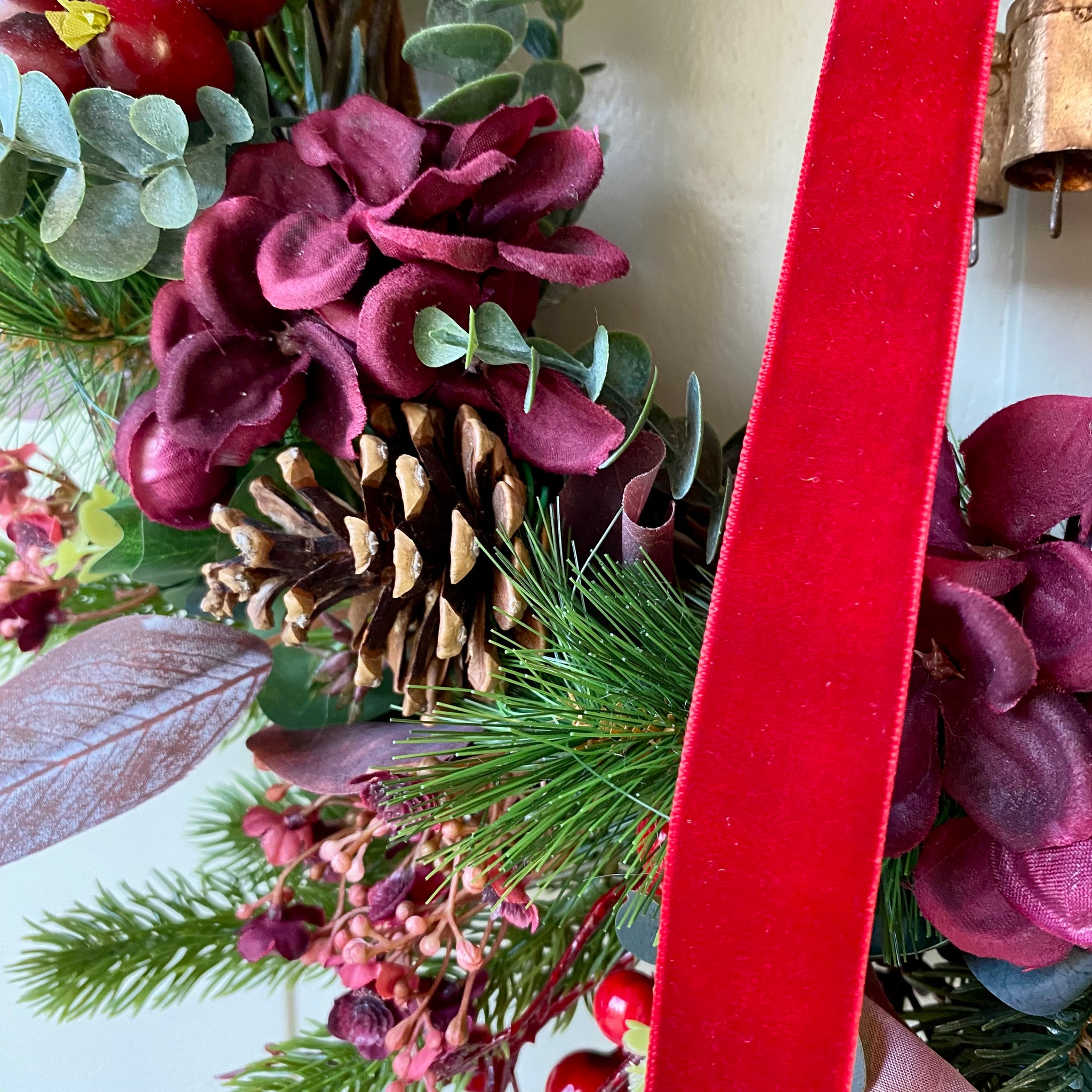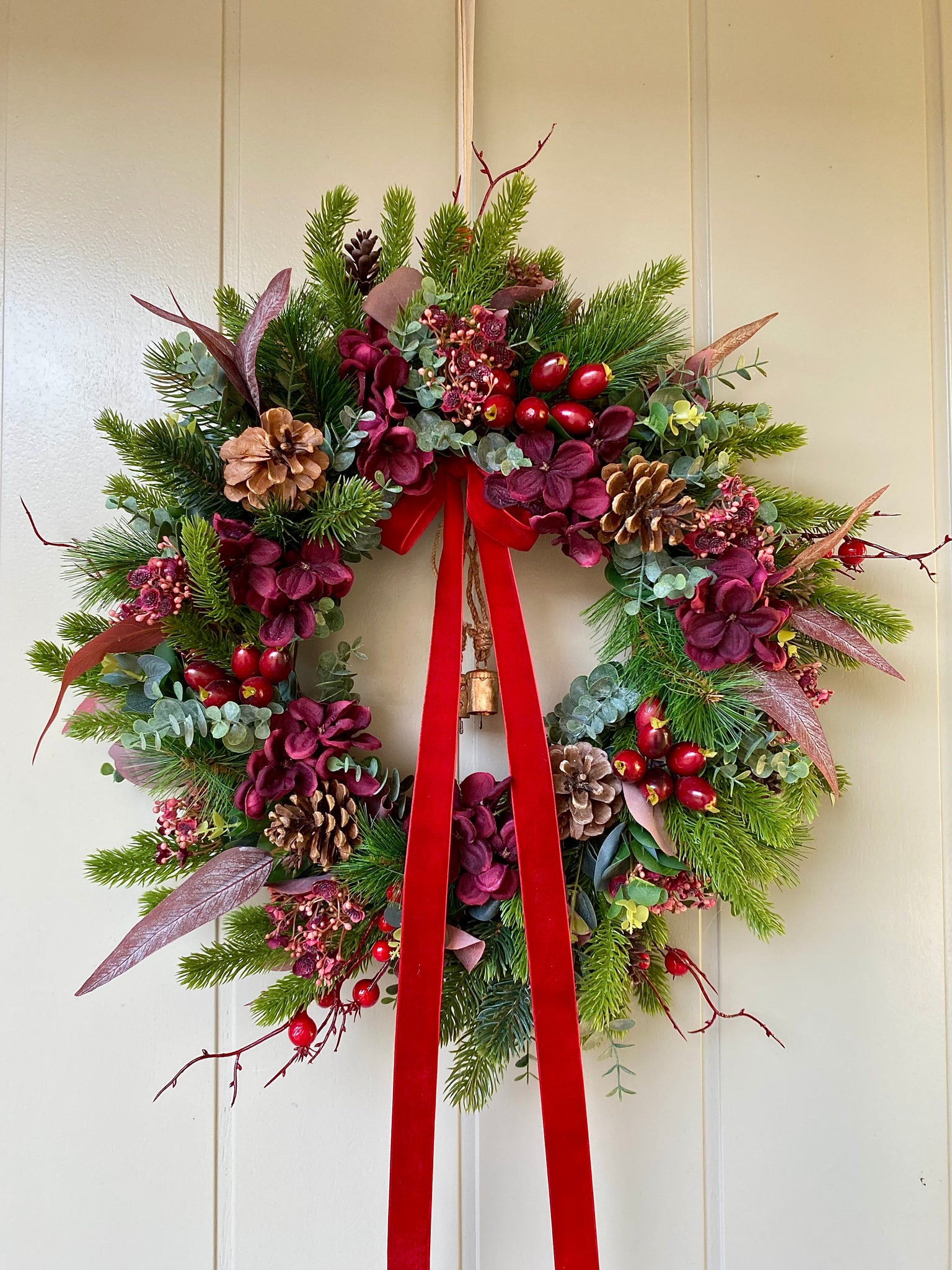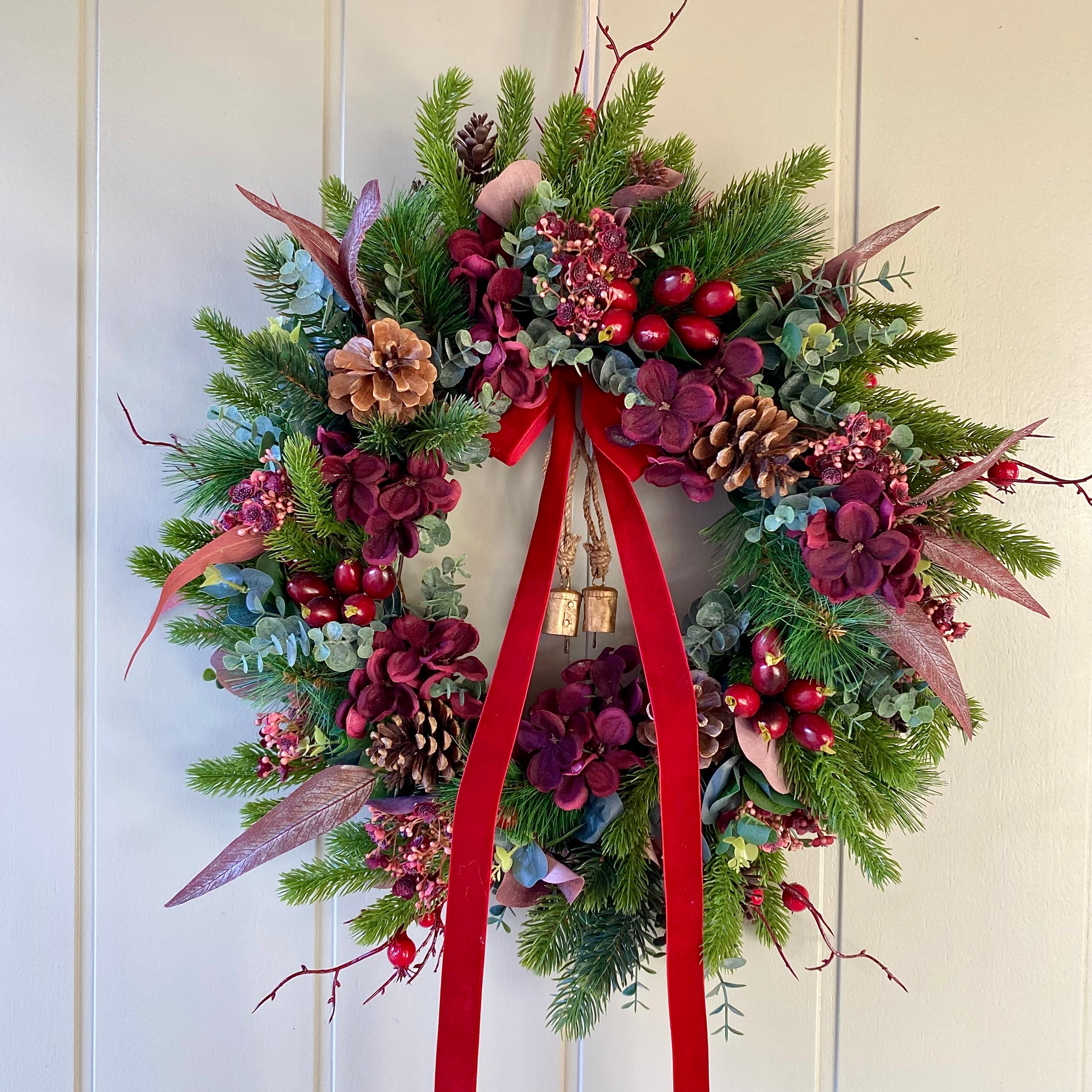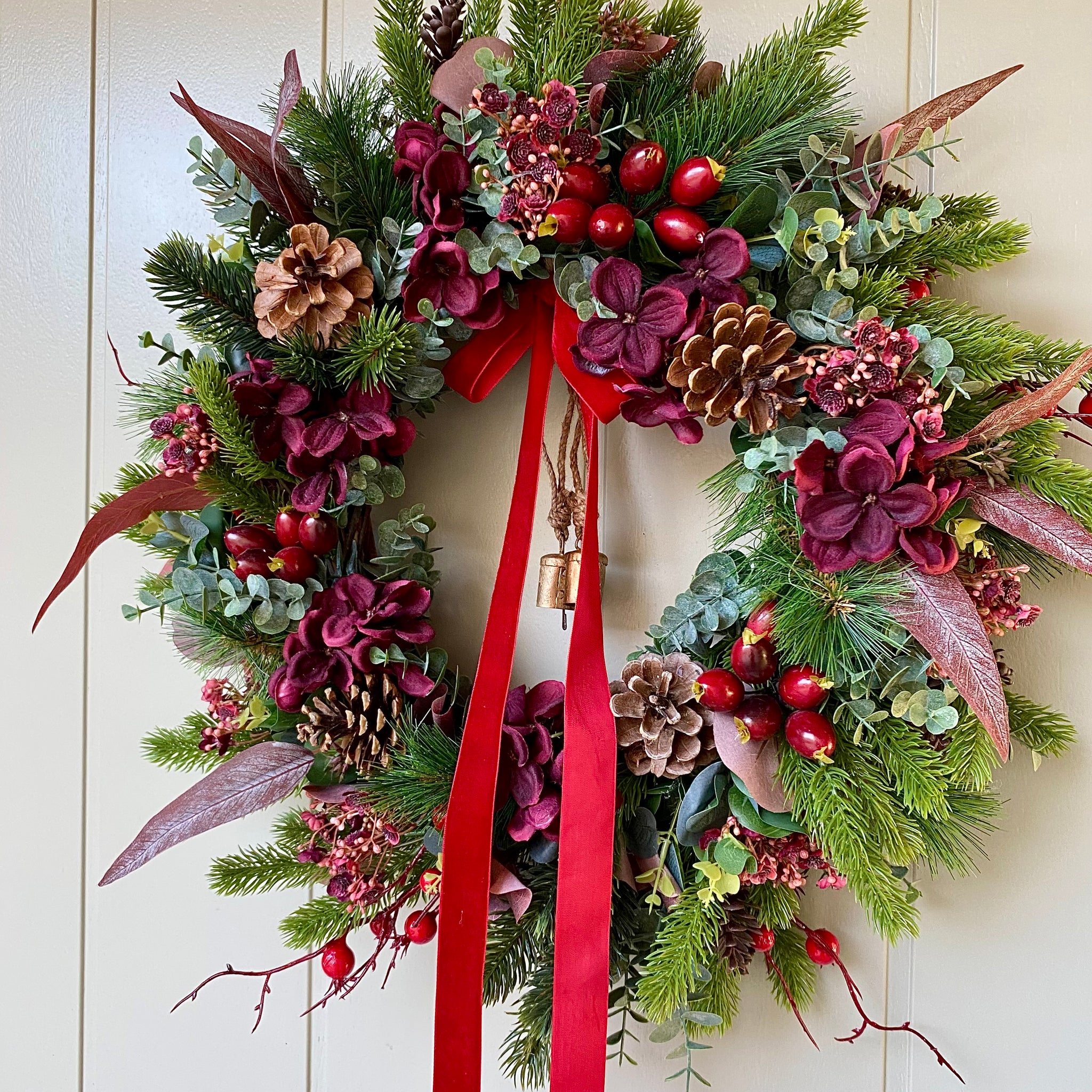 Our gorgeously festive Christmas Hydrangea Wreath is bursting with beautiful burgundy tones, ruby red hydrangeas, rustic pine cones, brass cow bells and velvet red ribbon. This charming seasonal piece brings warmth and character to any doorway or wall, blending natural textures with festive sparkle and the delicate cow bells add a cheerful jingle to your holiday décor. Perfect for creating that cosy and warm Christmas atmosphere in your home.