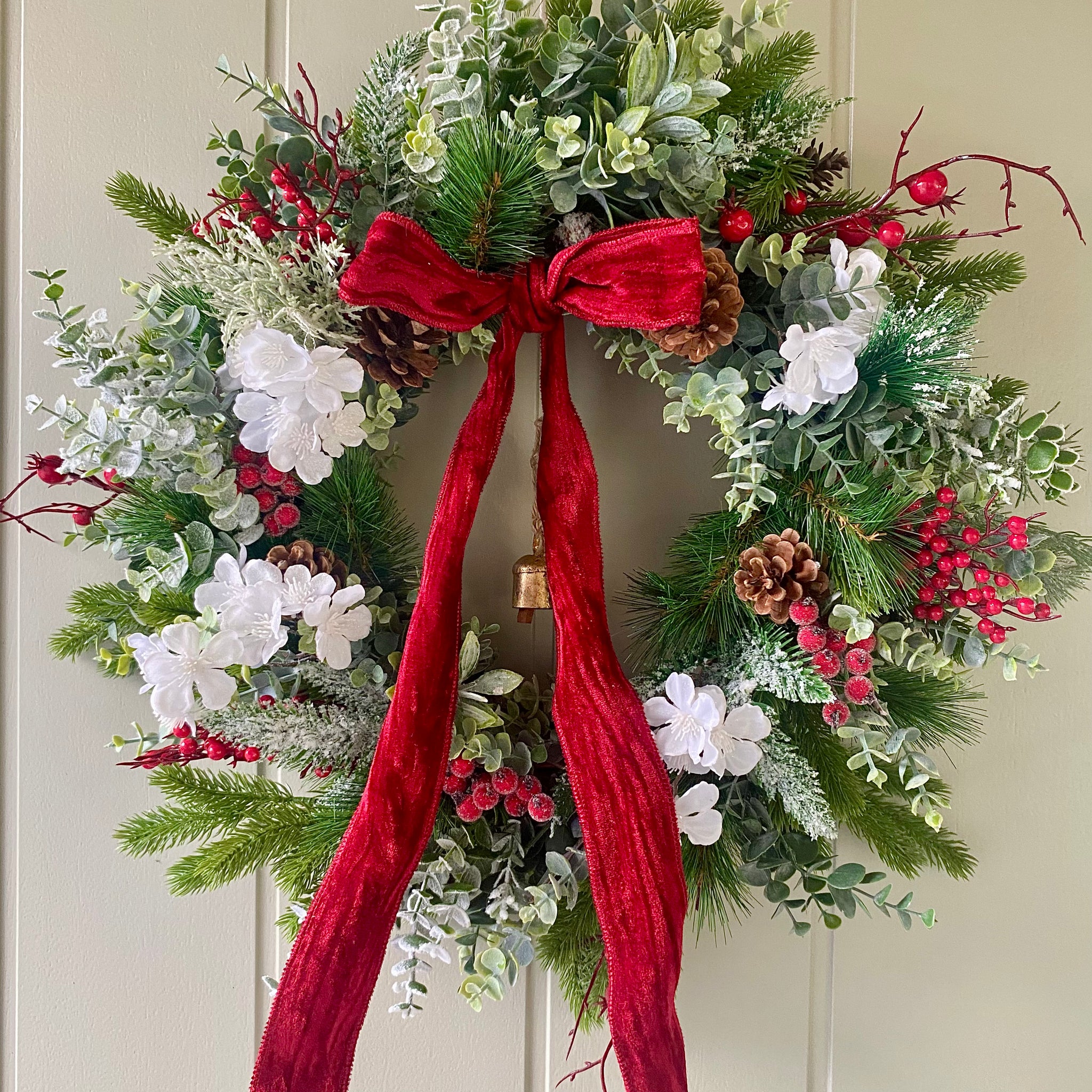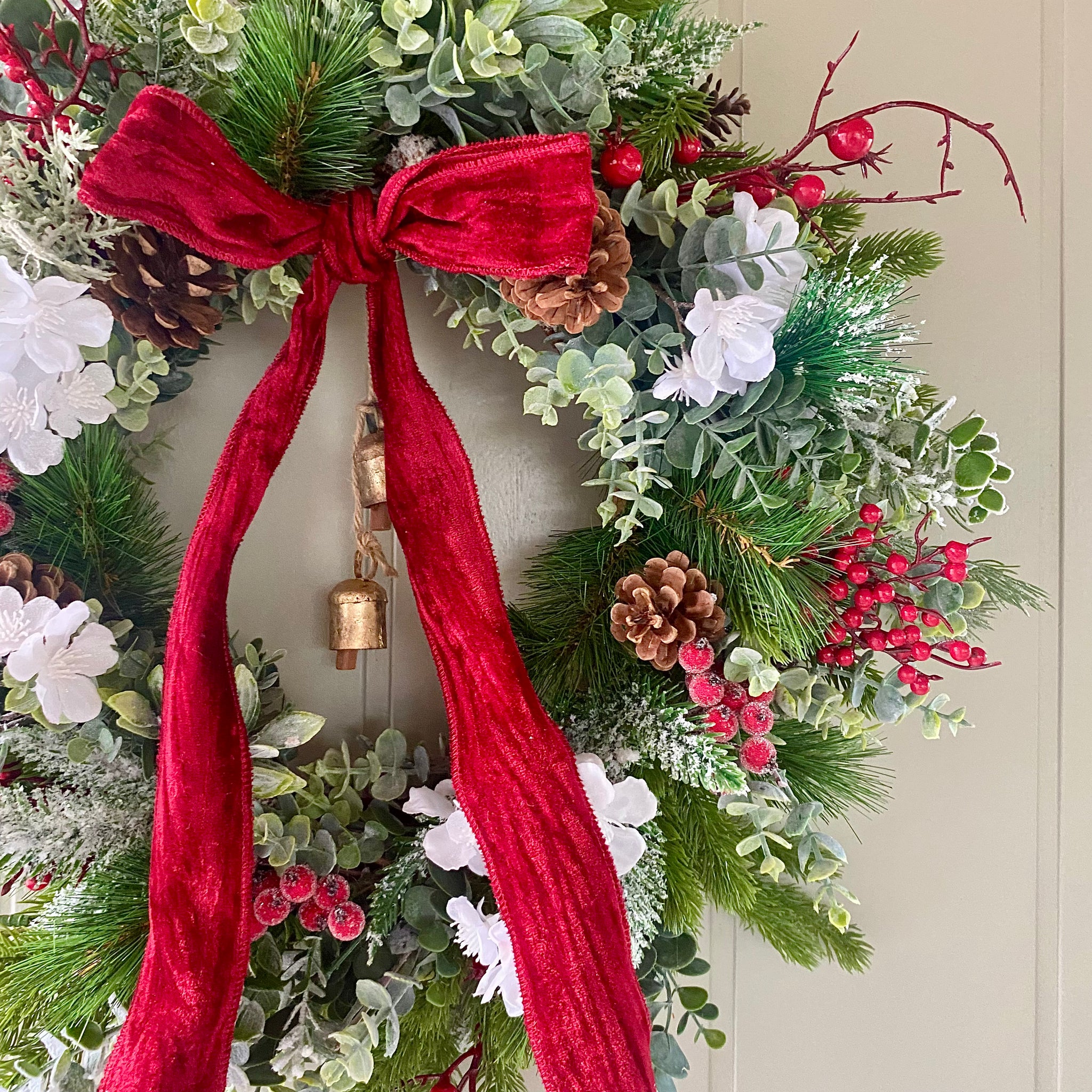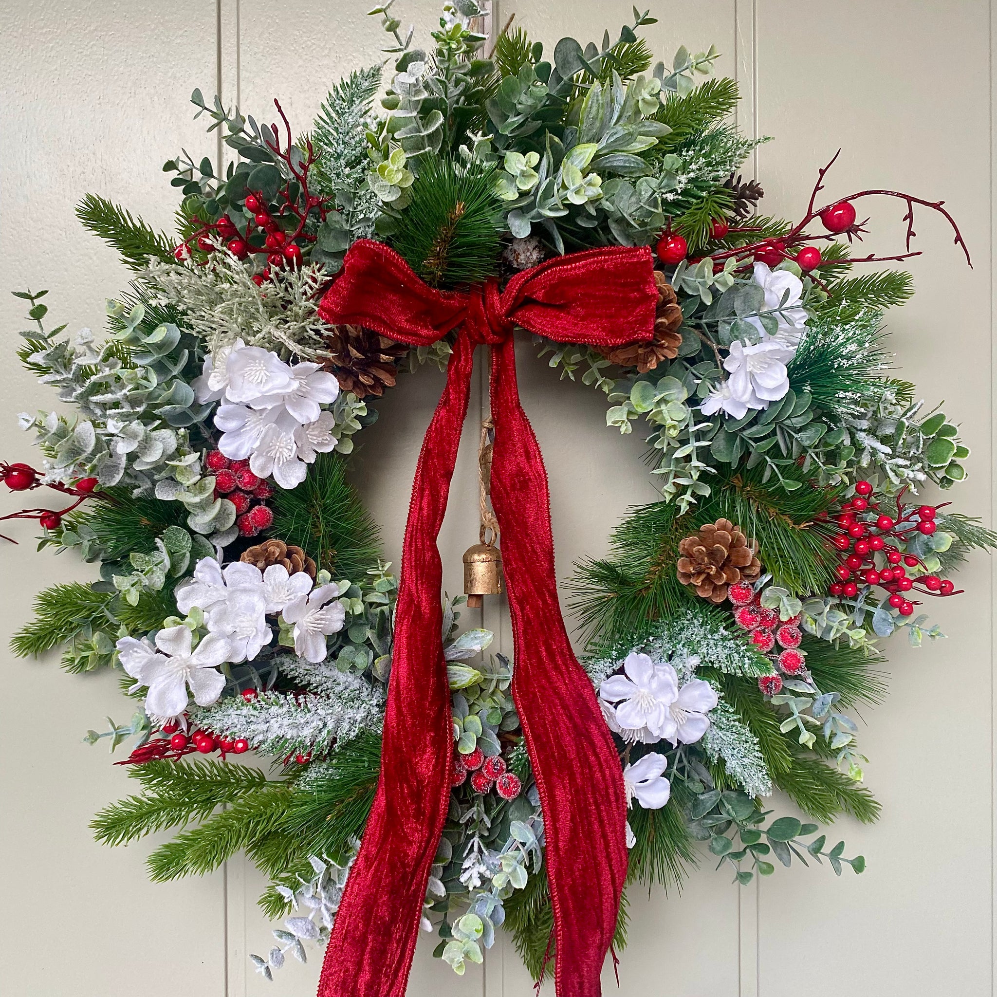 Bring festive cheer to your entrance with this stunning Christmas wreath, bursting with eucalyptus, pine, thistle, and cedar leaf. Rustic pine cones and vibrant red berries create a wintery wonderland effect, white frosted winter blossoms, brass cow bells and an oversized red velvet ribbon adds that touch of indulgence. The perfect luxury statement piece to elevate your Christmas décor and welcome guests in style.