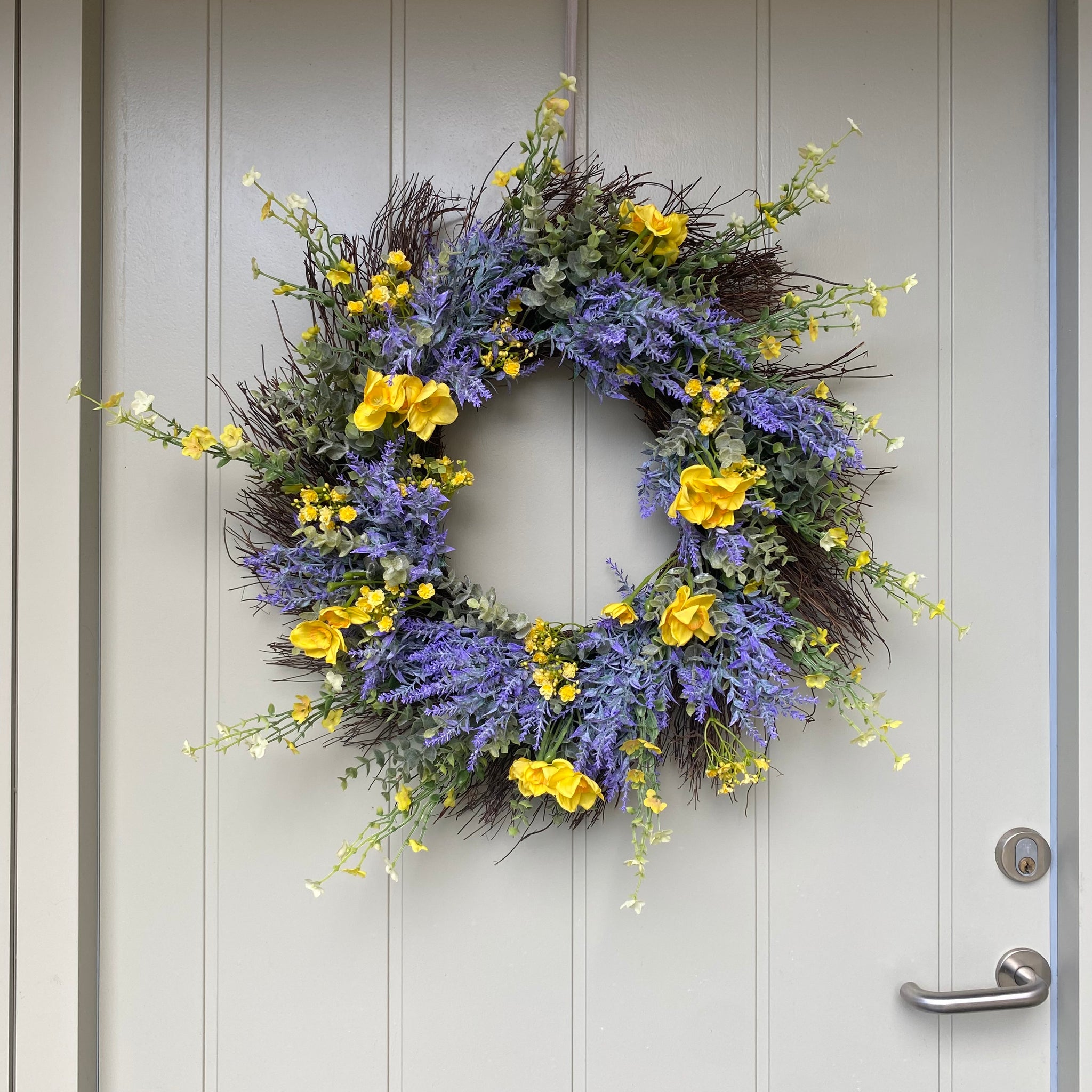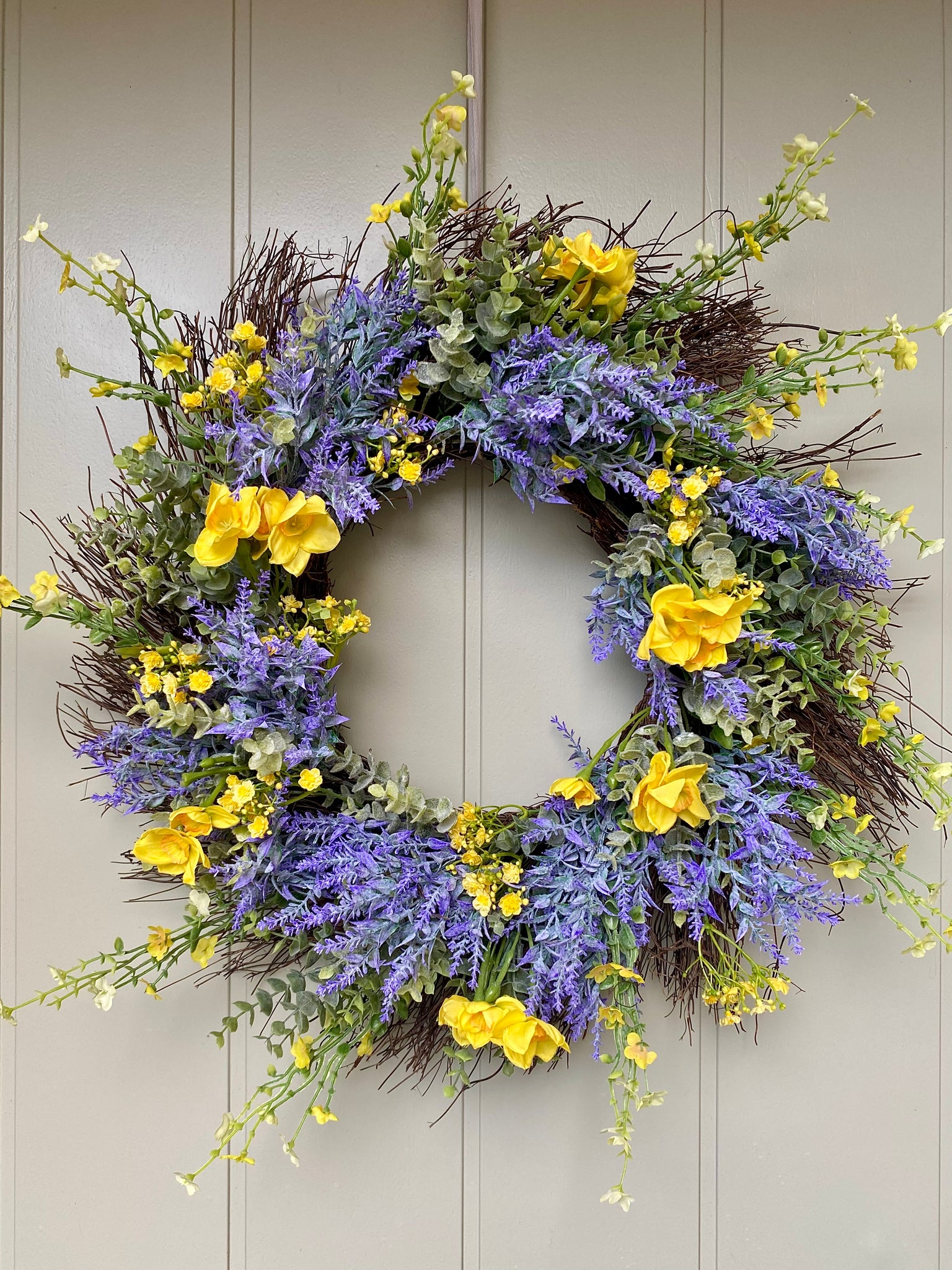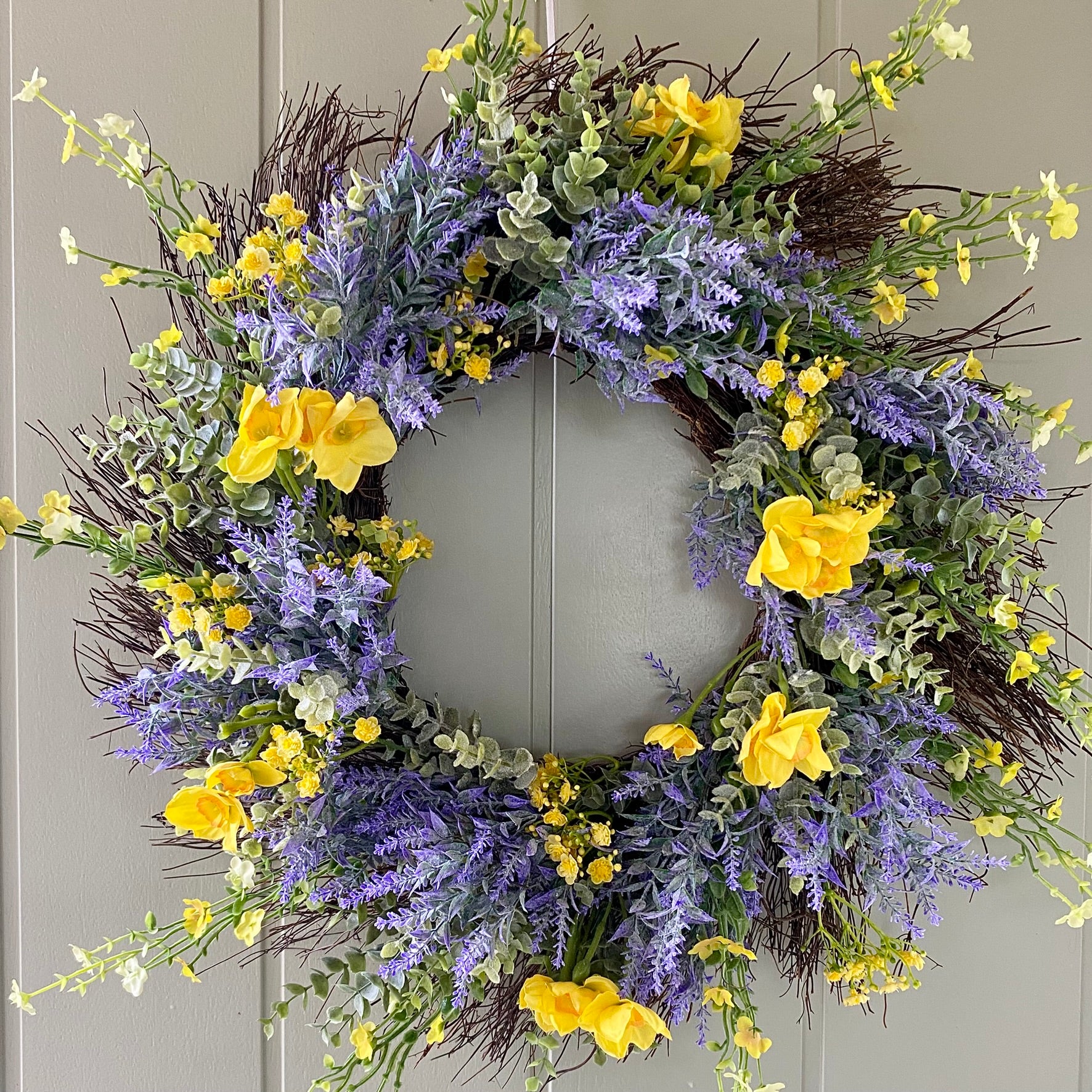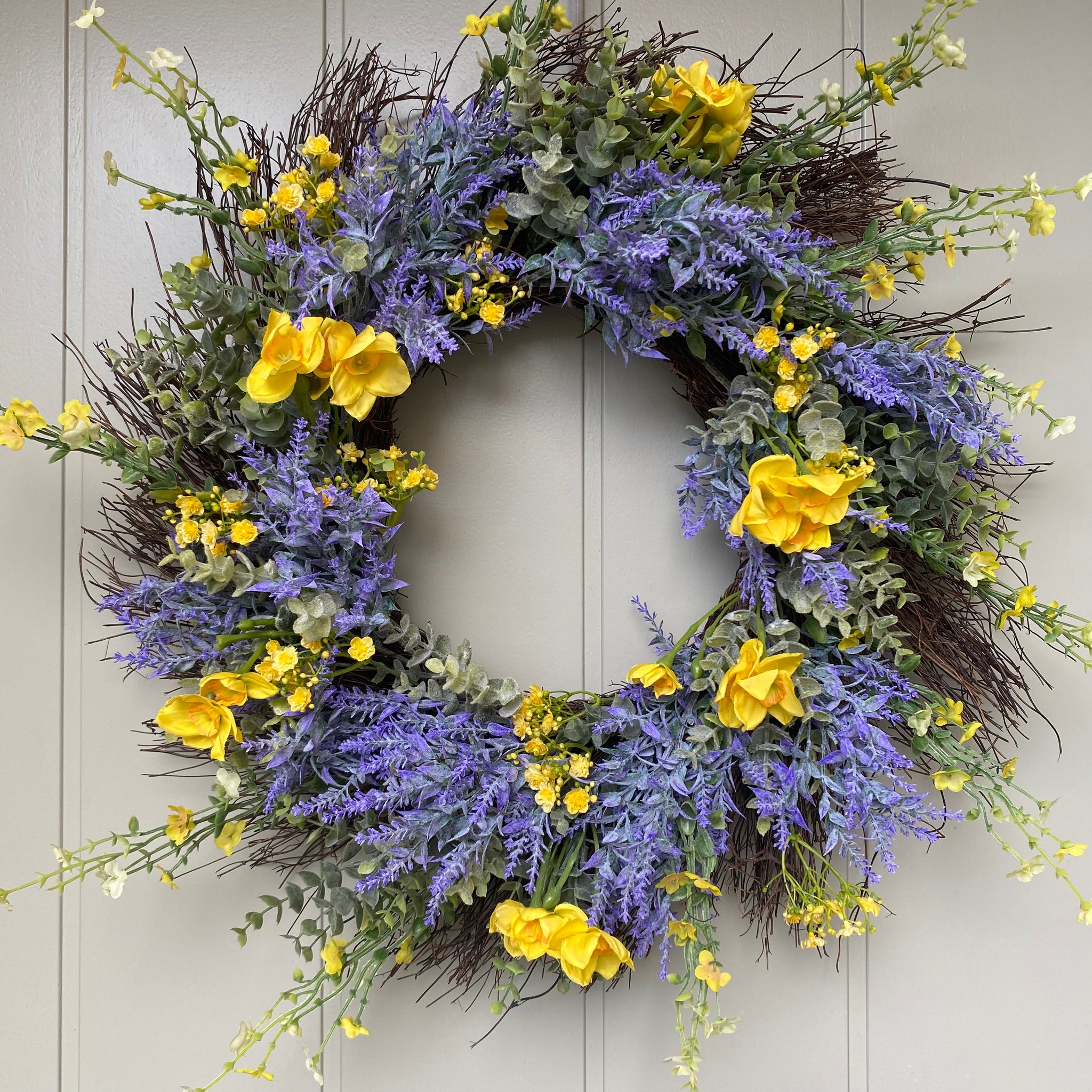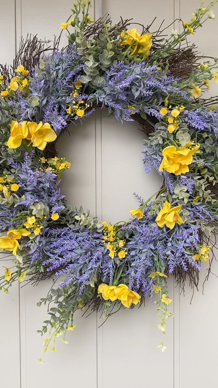 Welcome spring in style with this charming rustic wreath. Beautiful lifelike silk daffodils nestled among eucalyptus, and lavender, delicate gypsophila blooms and twigs add an extra touch of whimsy. The realistic botanicals create an inviting focal point for your entryway that'll have guests doing a double-take. Includes a velvet ribbon for effortless hanging. Perfect for breathing fresh seasonal cheer into your home without the wilting worry.