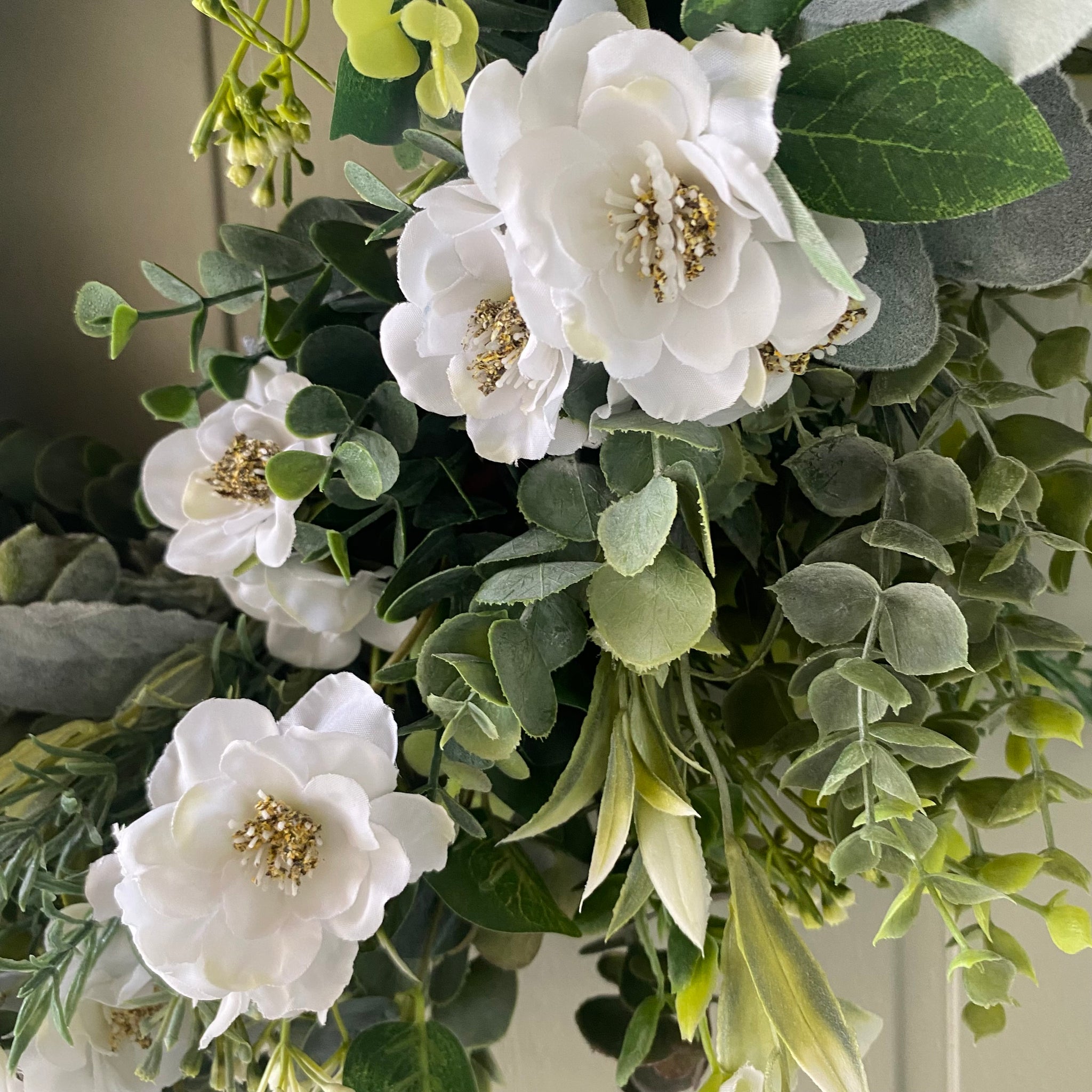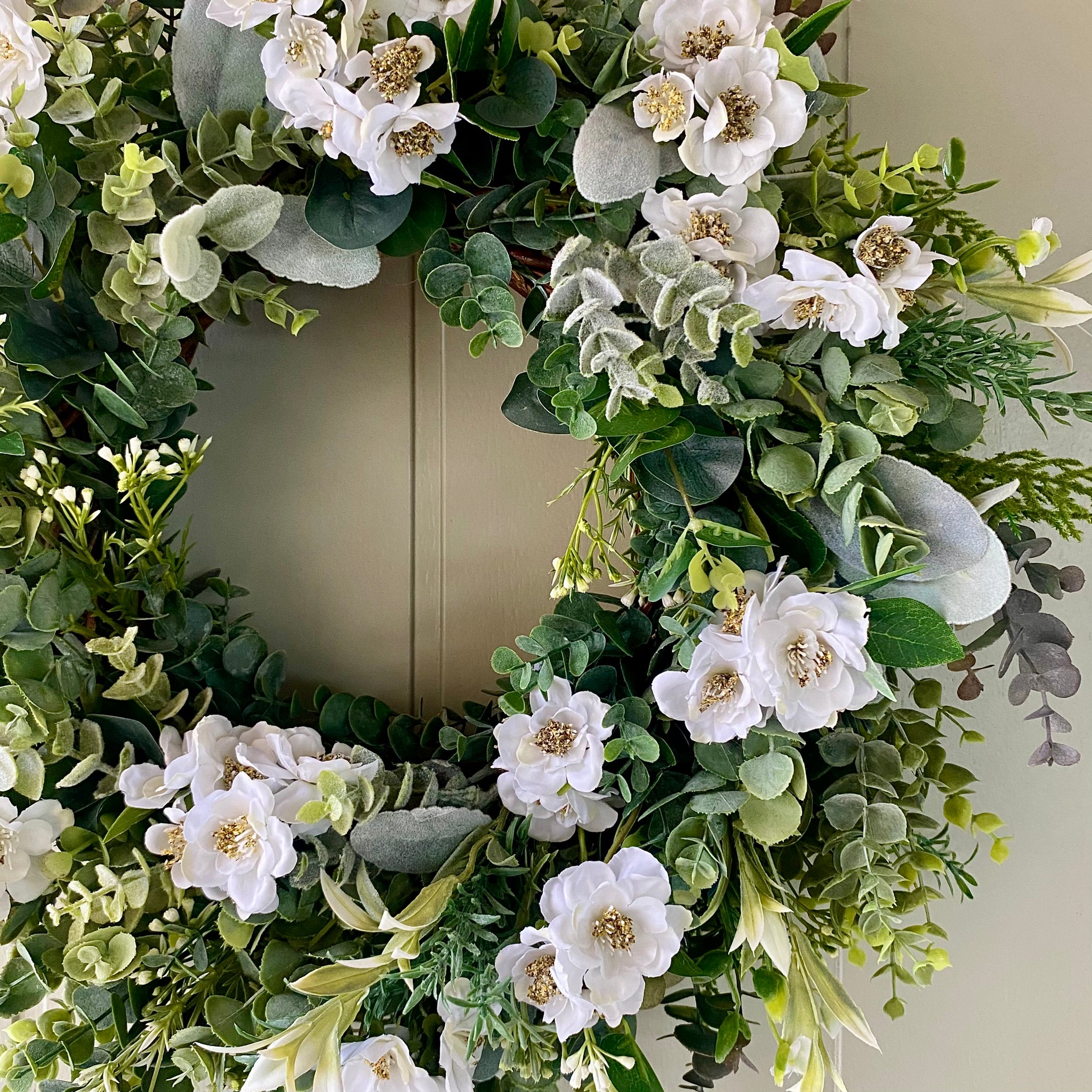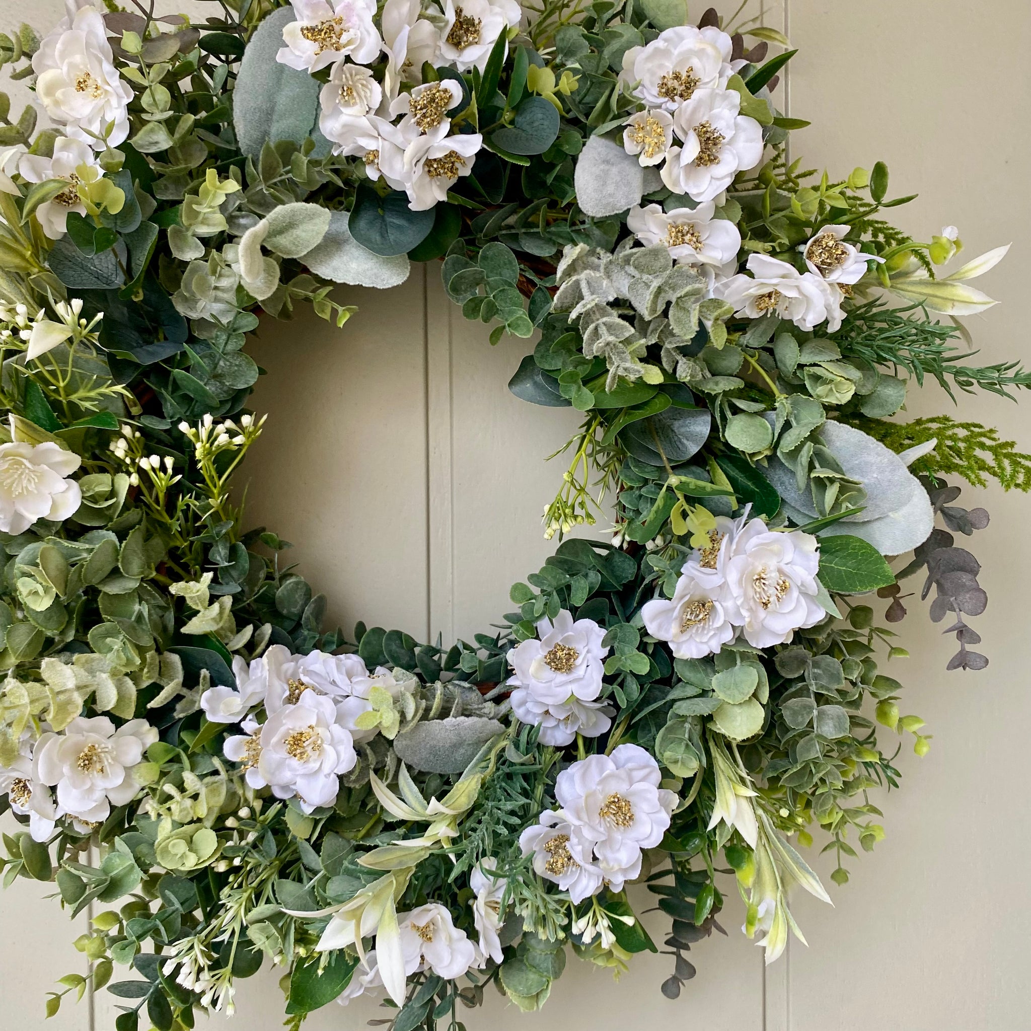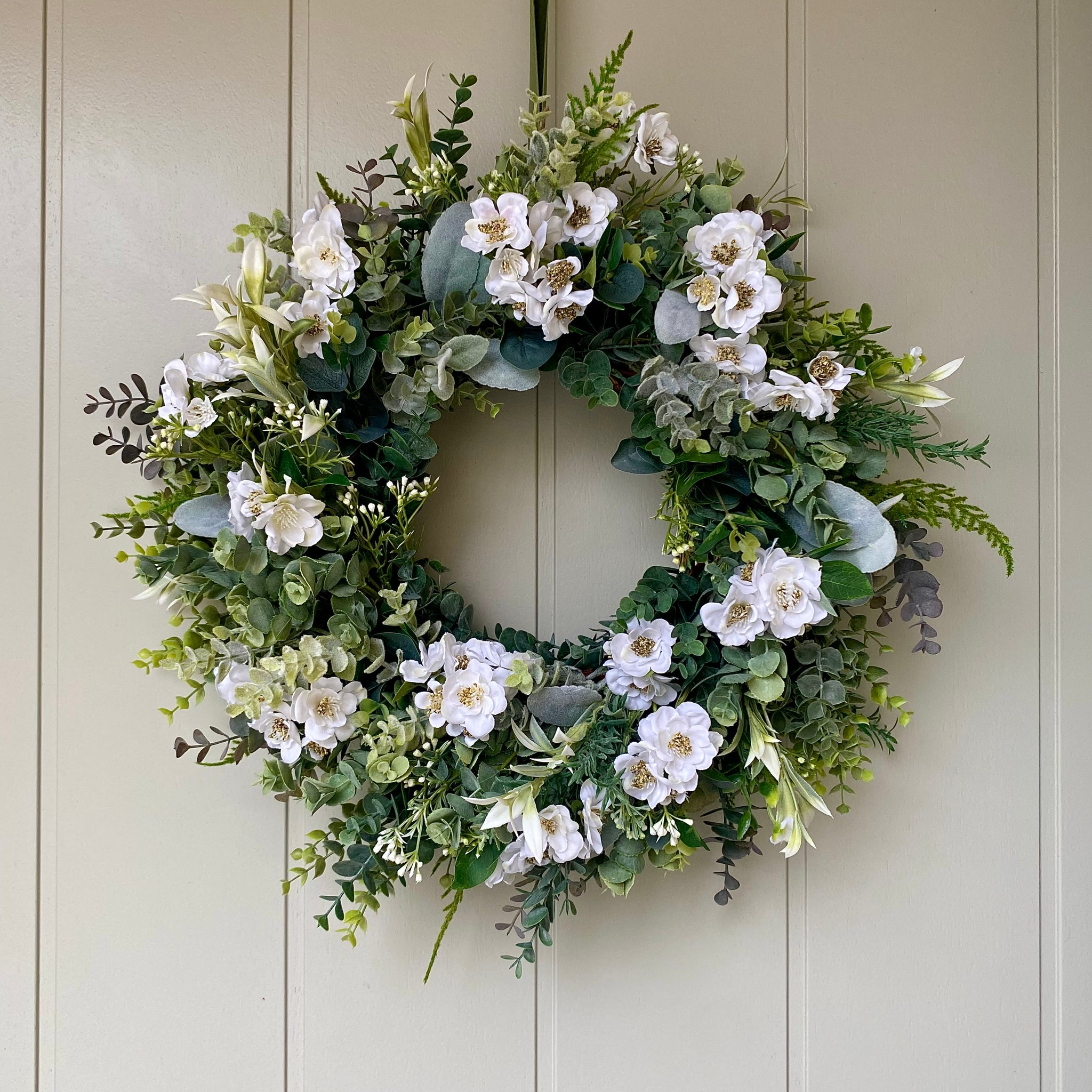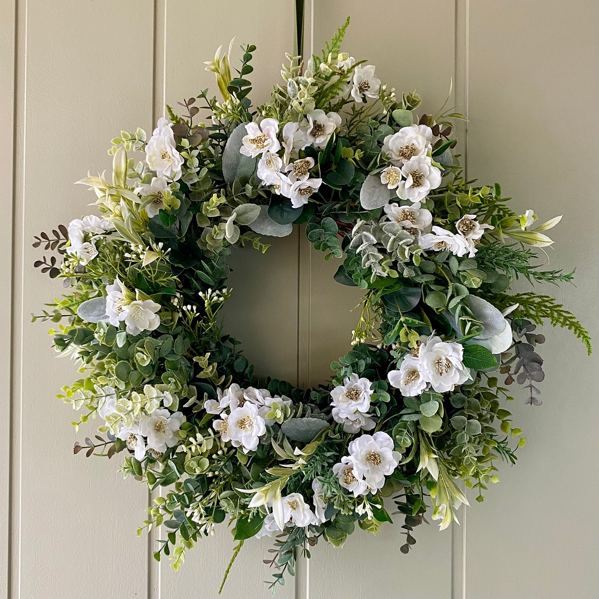 Nothing says Spring like a beautiful Cherry Blossom tree. Now you can enjoy this gorgeous flower on your door. An abundance of incredibly realistic white cherry blossom flowers are combined with eucalyptus, lambs ear, sage and fern to make a beautiful spring wreath. Comes with velvet ribbon to hang.
