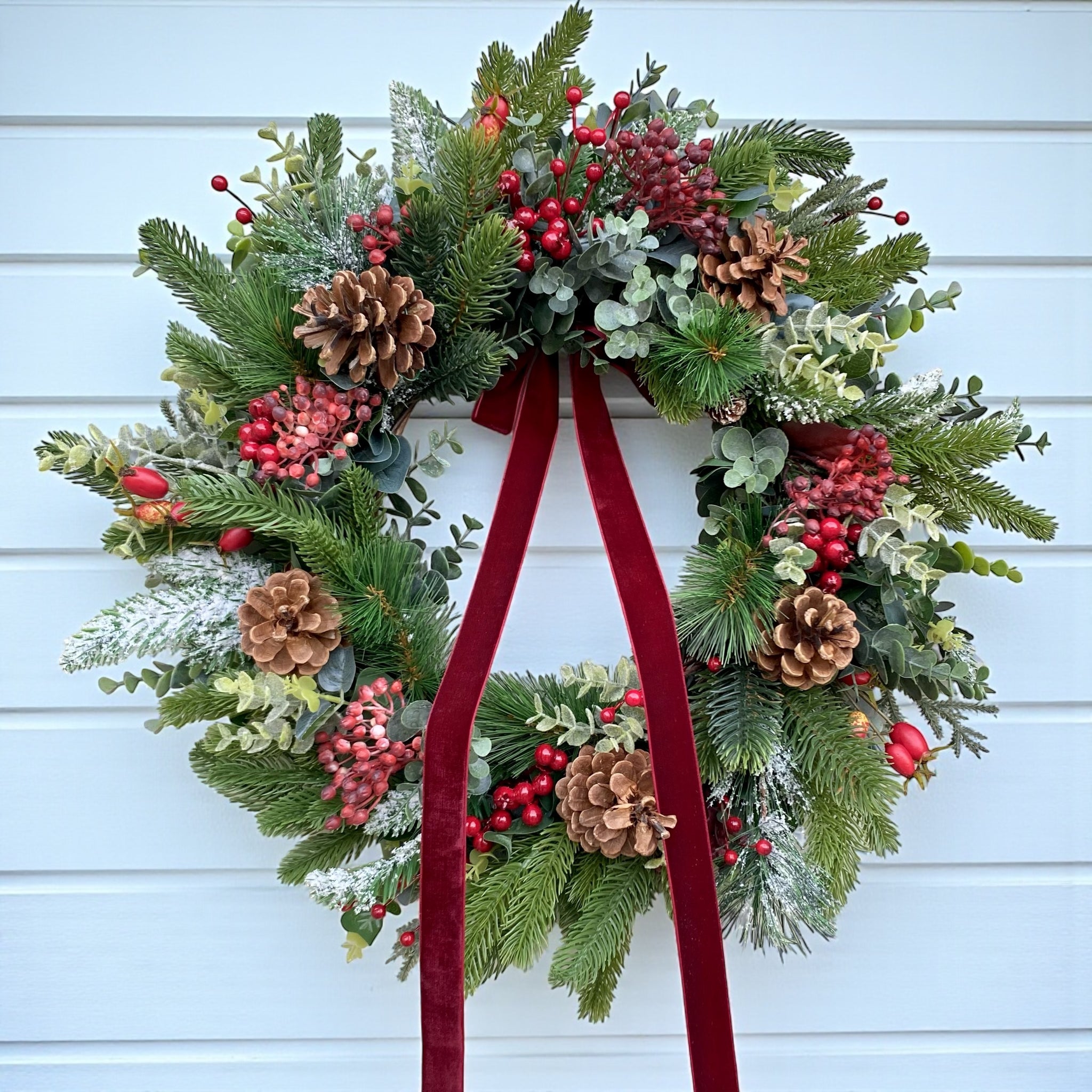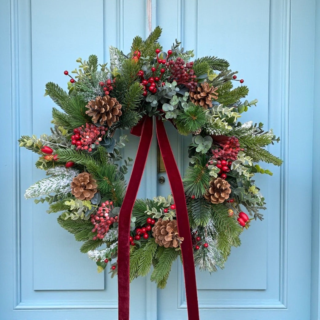 One of our best sellers, this stunning wreath is bursting with winter berries and Christmas foliage and finished with a beautiful velvet ribbon. Frosted red berries, rich cranberries and russet red berry sprays mixed with eucalyptus, spruce and pine cones.