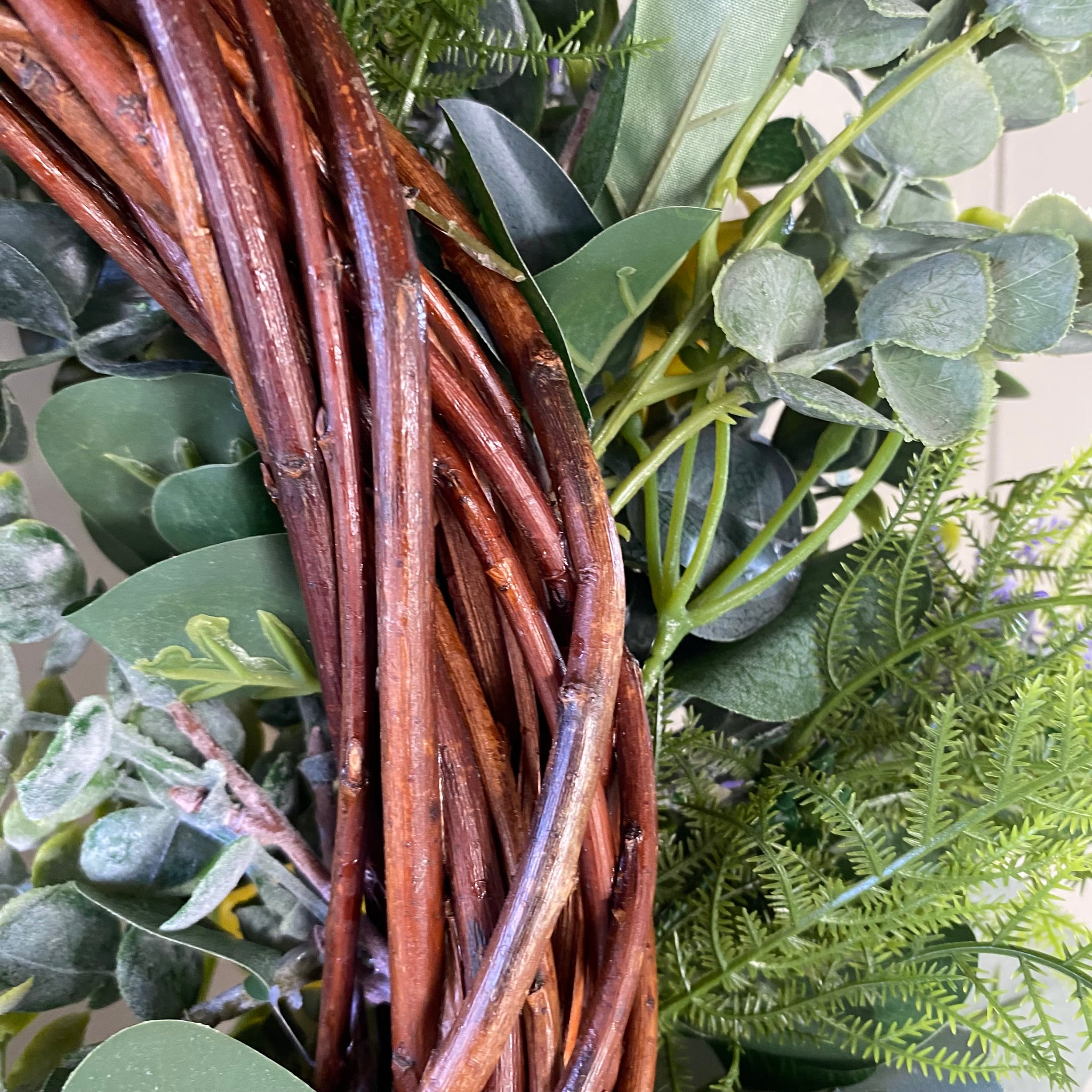 Measures 50cm approx. Measurement is from leaf tip to leaf tip. Made on a 30cm wreath base with faux foliage.