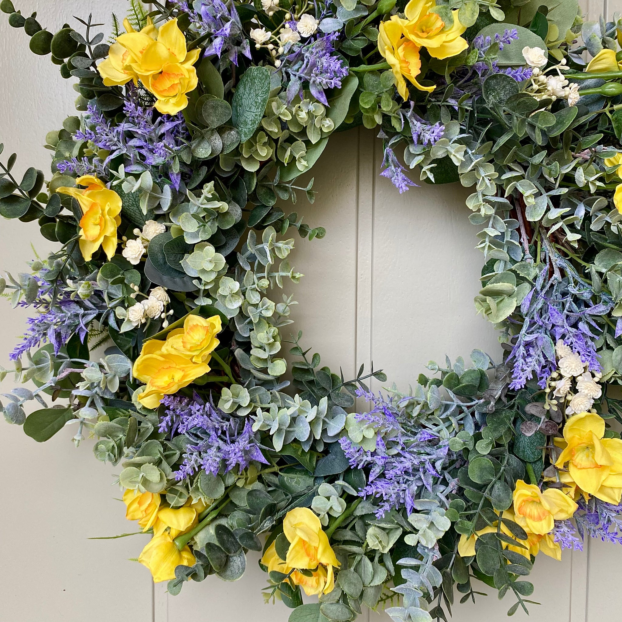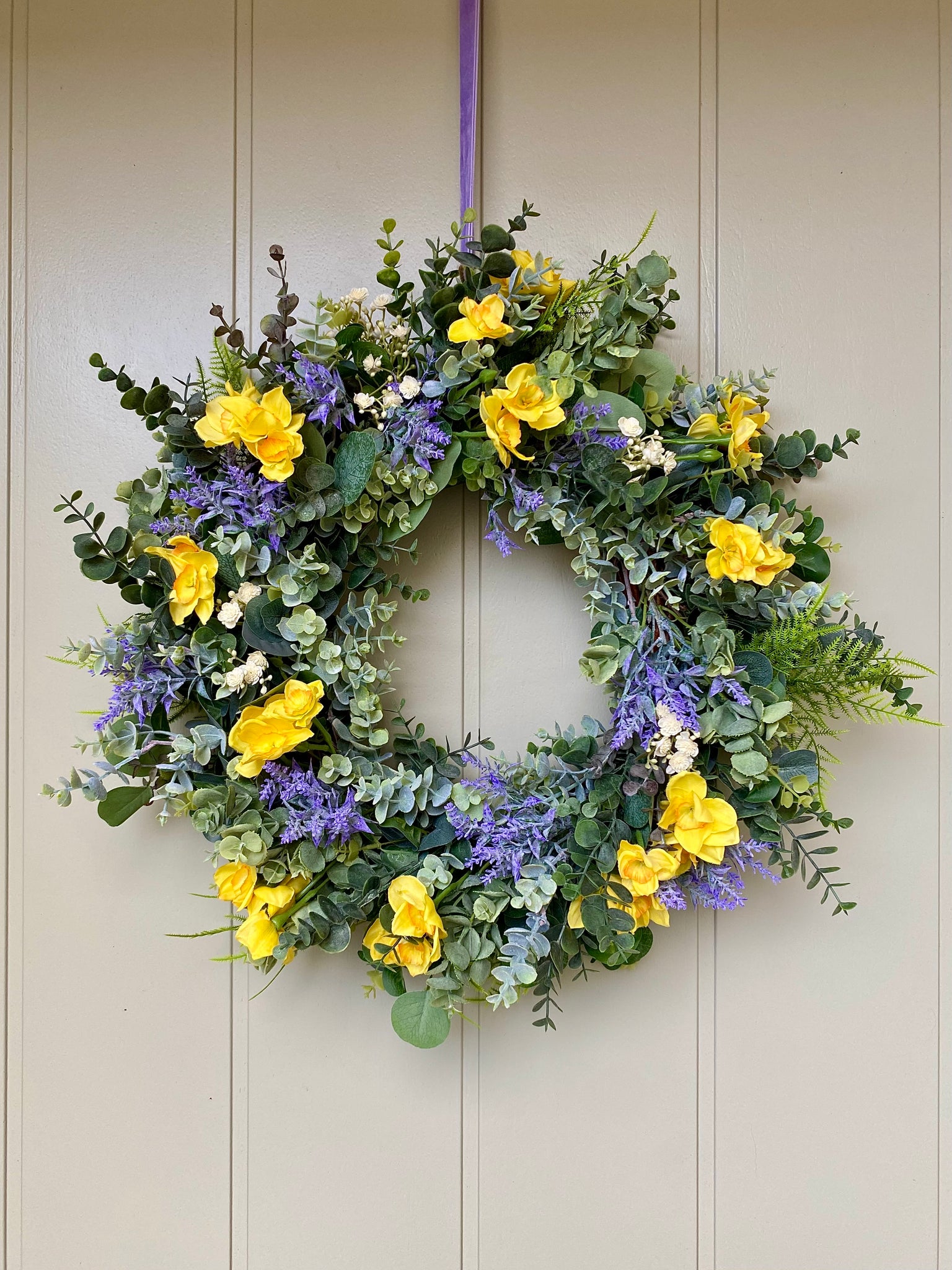 Celebrate the arrival of Spring with our gorgeous Daffodil Wreath. Beautifully realistic silk daffodils are nestled in a mix of lush faux greenery of fern, eucalyptus, ruscus and meadow grass, lavender and a sprinkling of gypsophila flowers. Bring colour and style to your door. Comes with velvet ribbon to hang.